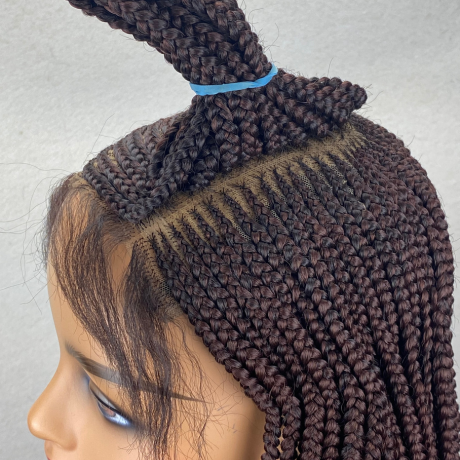A  transparent lace front cornrow wig, that requires no glue or any special installation process. The well-laid-out cornrows make the lace firm to wear, and pre-plucked baby hair makes the wig a perfect choice for the modern busy woman.